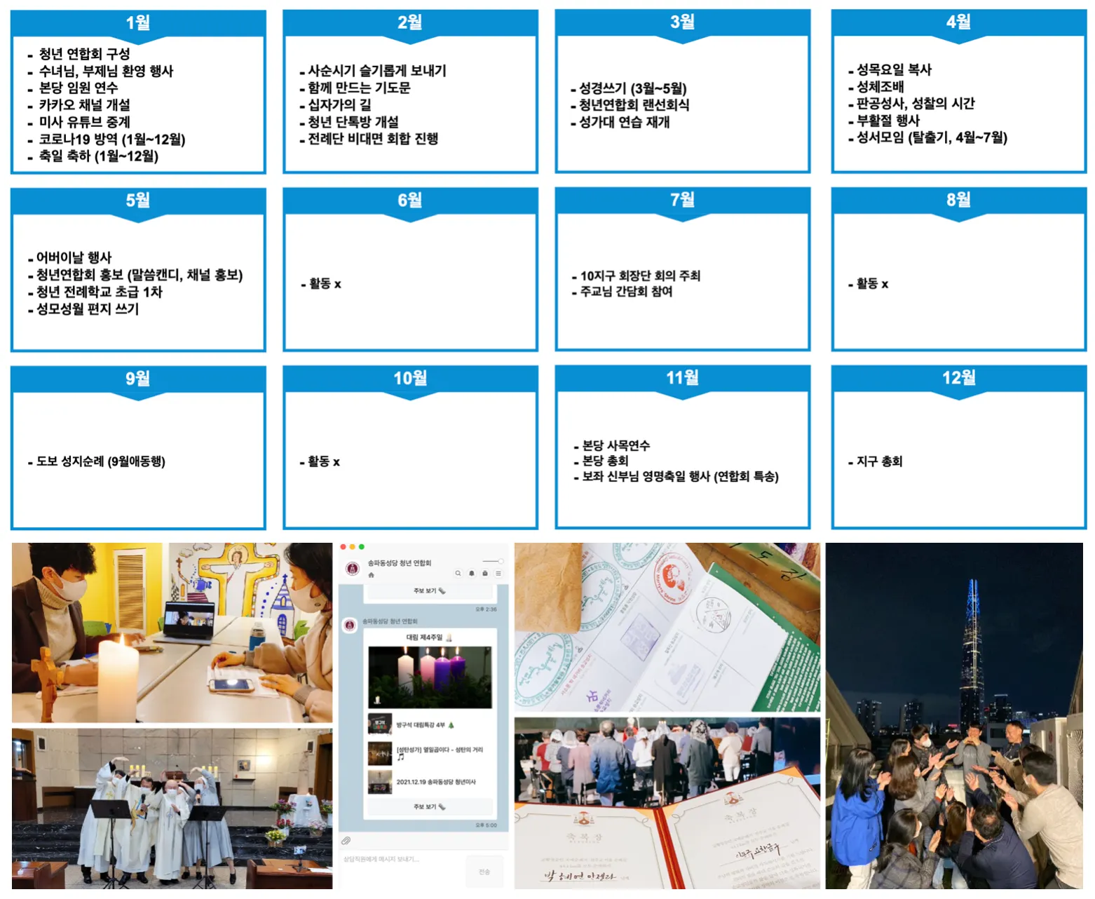 그 외에도 봉사하는 분들이 부담을 갖지 않도록 부하를 분산시켰고, 성삼일 / 축일 특송 등 전례단과 성가대가 서로 연대하여 활동한 점도 나름 고무적이었다. 그리고 코로나 발열체크, 방역 등 신앙생활과 거리가 먼 일들은 대부분 내가 담당하여 각자 하고 싶은 일에 집중할 수 있도록 환경 조성에 힘썼다. 그 덕분인지 현재 전례단 5명, 성가대 8명으로 단체가 안정적으로 운영 중이다.