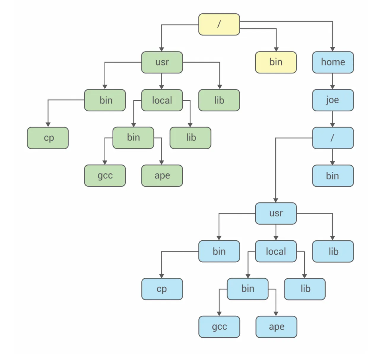 컨테이너는 이미지에 따라서 실행되는 환경(파일 시스템)이 달라집니다. 컨테이너가 서로 다른 파일 시스템을 가질 수 있는 이유는 chroot(change root!)를 활용하여 이미지(파일의 집합)를 루트 파일 시스템으로 강제로 인식시켜 프로세스를 실행하기 때문입니다.