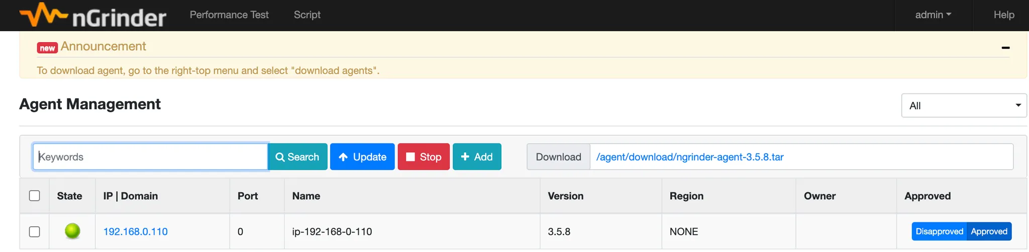 $ wget http://[Controller Internal IP]:8080/agent/download/ngrinder-agent-3.5.8.tar